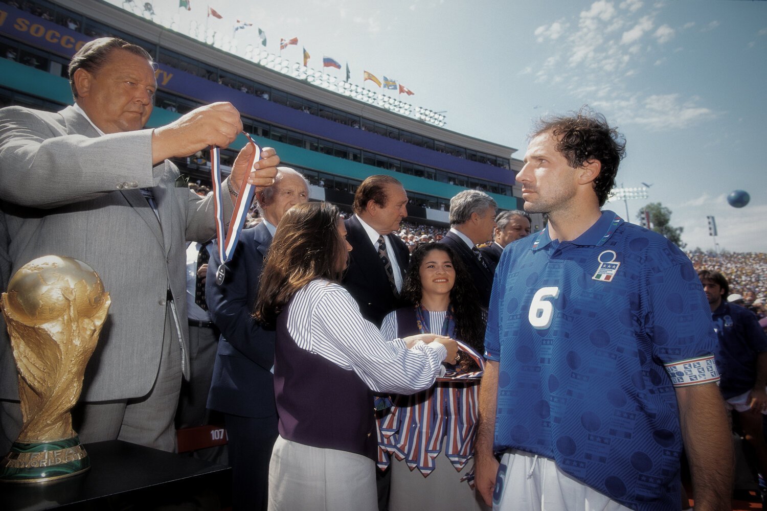 There are two images of mine that might illustrate this point, one is the picture of the Two Bobbies, and the other is the picture of the Italian captain from the World Cup Final in 1994. For The Two Bobbies picture, I remember framing up with Charlton on the right and whilst I held that framing I could see this figure of a police officer approaching from the left and knew I simply had to wait for him to enter the frame, and thats exactly what happened. I made just one frame on the Bobbies image, yet I now suspect in this age with a motor driven digital camera, todays sports photographer would probably have made more like fifty shots. Now, the image of Franco Baresi, the captain of Italy in 1994. He is coming up to get his second place medal. You look at him and know that something is going on inside. He isn't showing any emotion – his switch is set to off. He's trying hard not to look angry, sad or pissed off. In fact, he doesn’t wish to be there, he would prefer if the ground would open up and he could crawl into the hole. He is about to get the medal put around his neck and its more like a noose. The World Cup is tantalisingly close, maybe less than a metre away but he has to ignore it and walk past it, but like the Two Bobbies there are no before or after images, it's simply one frame. As before, I framed up and simply waited until every element in the image came together. I suppose in a way it's rather like being well coordinated in a fashion clothing sense – everything working together, head to toe.