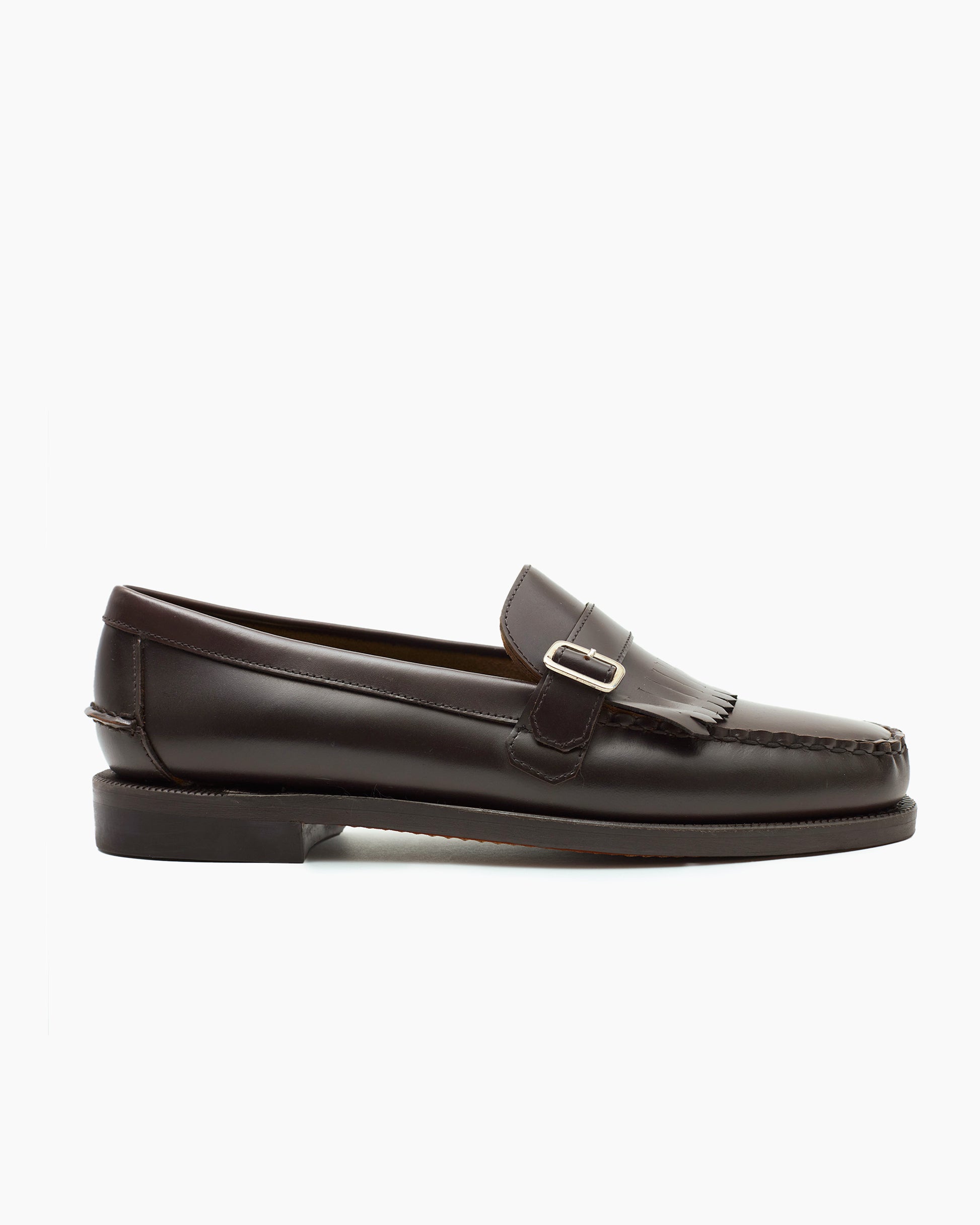 Crafted from brushed full-grain leather, the upper has a rich, softly textured finish that ages gracefully over time. A hand-stitched apron provides traditional character, while a delicate strap with buckle detailing and a distinctive tasselled fringe add elegance and individuality. Underfoot, a treated leather sole delivers flexibility and water resistance, supported by a moulded rubber heel for added durability and grip.